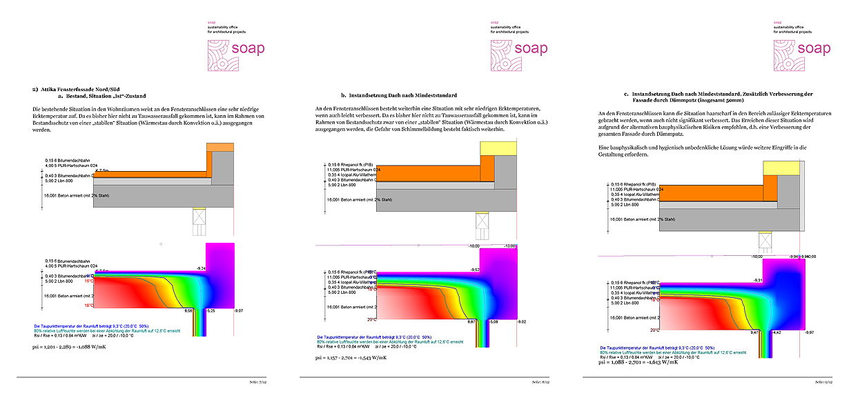 In der Simulation wurde nun die einfachste Maßnahme, der originalgetreue Neuaufbau des Flachdaches nach Mindeststandard berechnet und führte zunächst zu einer kritischen Verschlechterung. Durch die nun einseitge Erhöhung des Wärmeschutzes am Dach traten nun die punktuellen Wärmebrücken an Attika, Außenwand und Fenster, daß hier streckenweise Grenz- temperaturen von